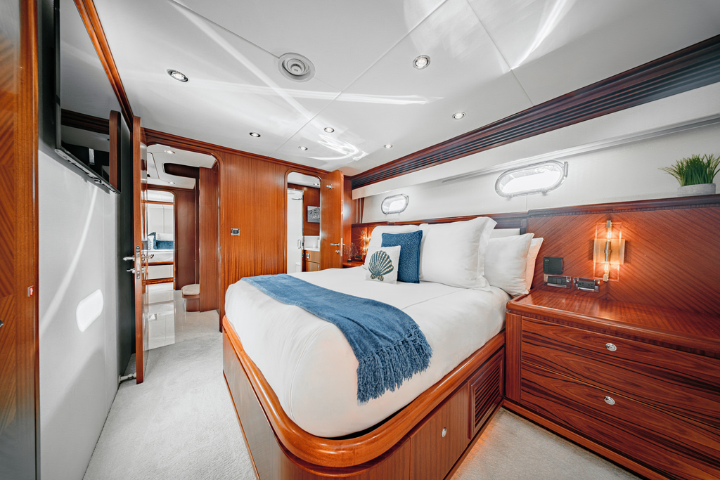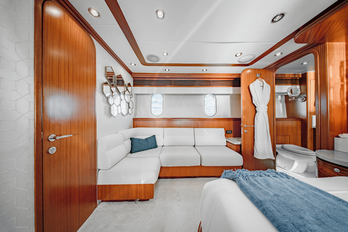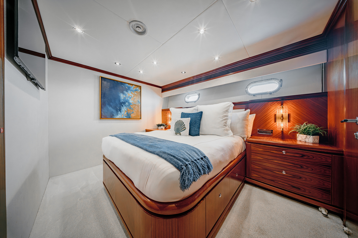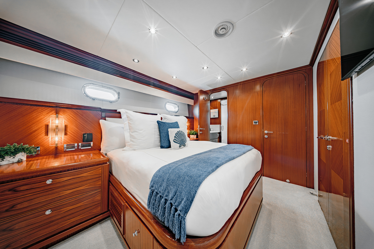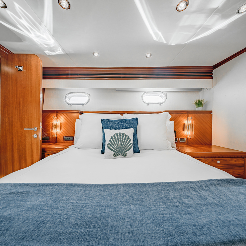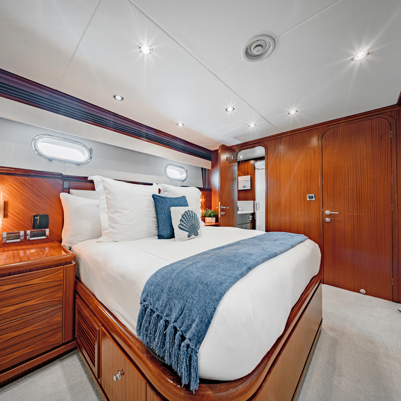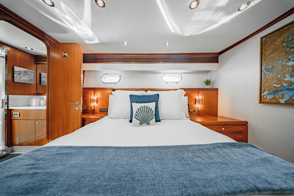 The full-beam master stateroom aboard Beachfront offers a private, elegantly appointed retreat, featuring a king-size bed, refined lounge seating, and abundant natural light through oversized porthole windows. Recently refreshed with new carpet, modern wall treatments, custom artwork, and updated window finishes, the space blends comfort with contemporary sophistication. The suite is complemented by a luxurious his-and-hers ensuite bath, complete with marble countertops, dual vanities, and a spacious granite-clad shower with both rainfall and standard fixtures.