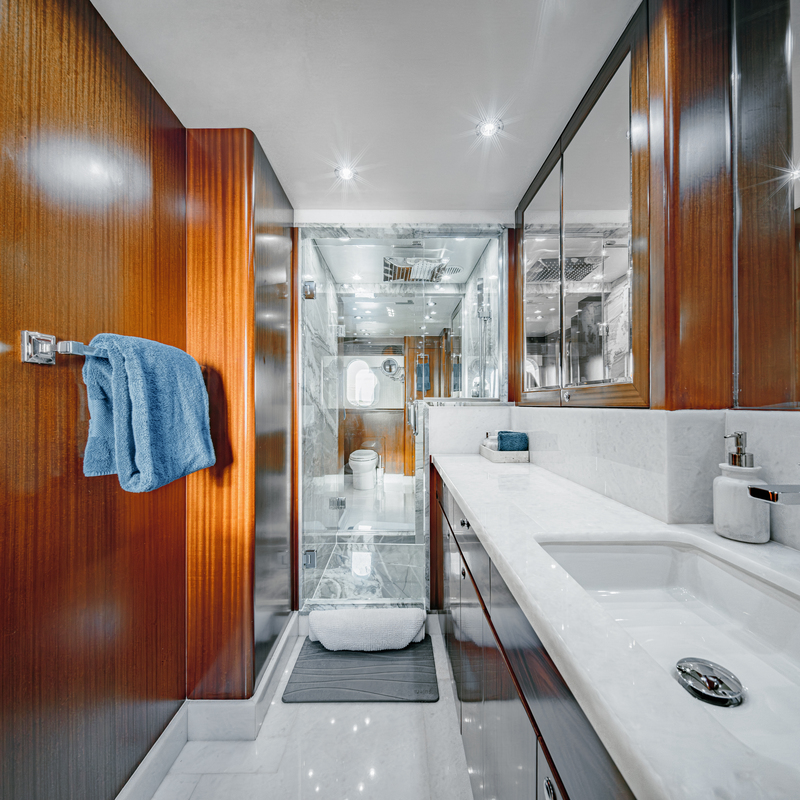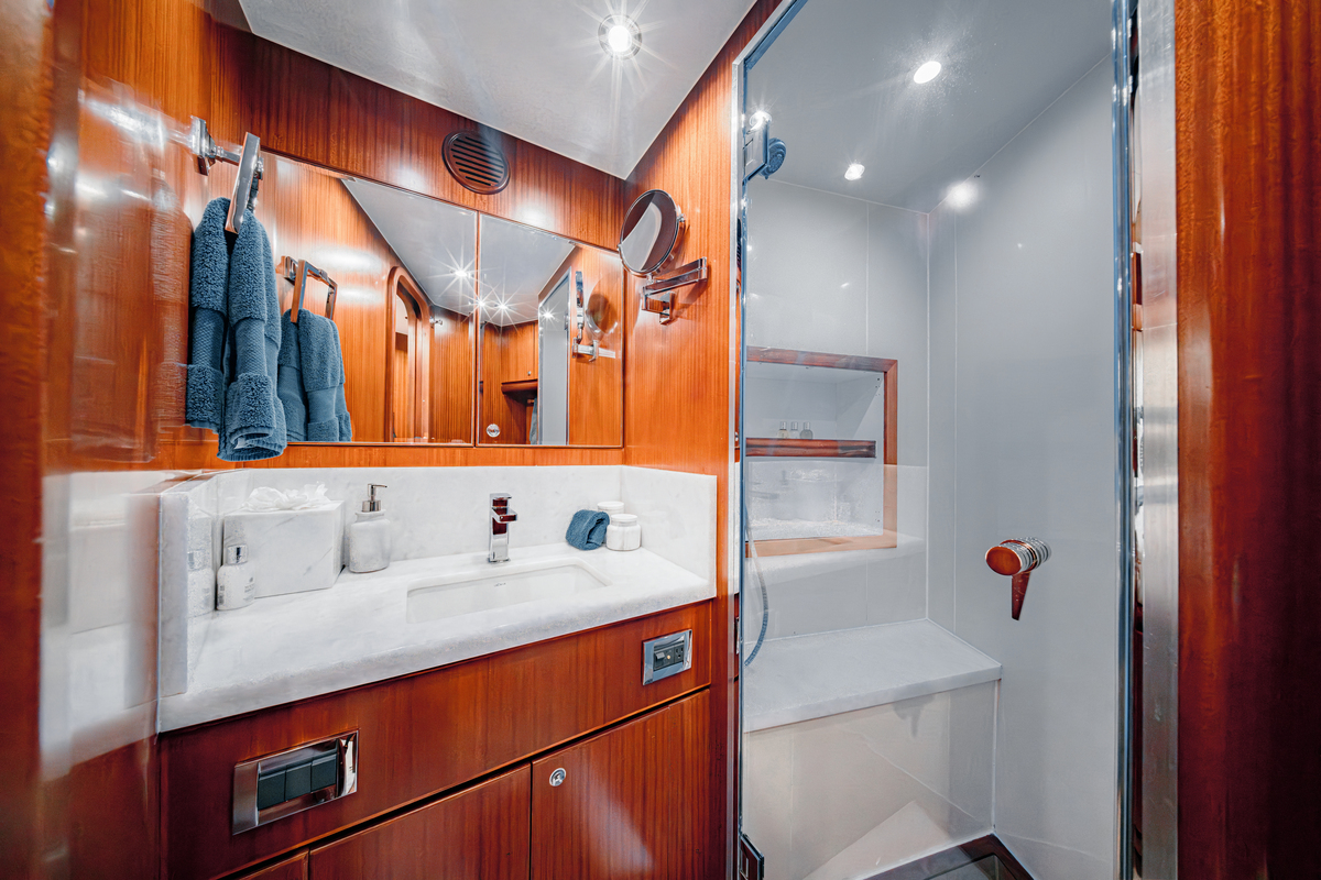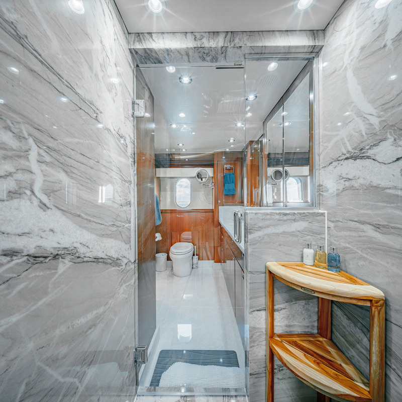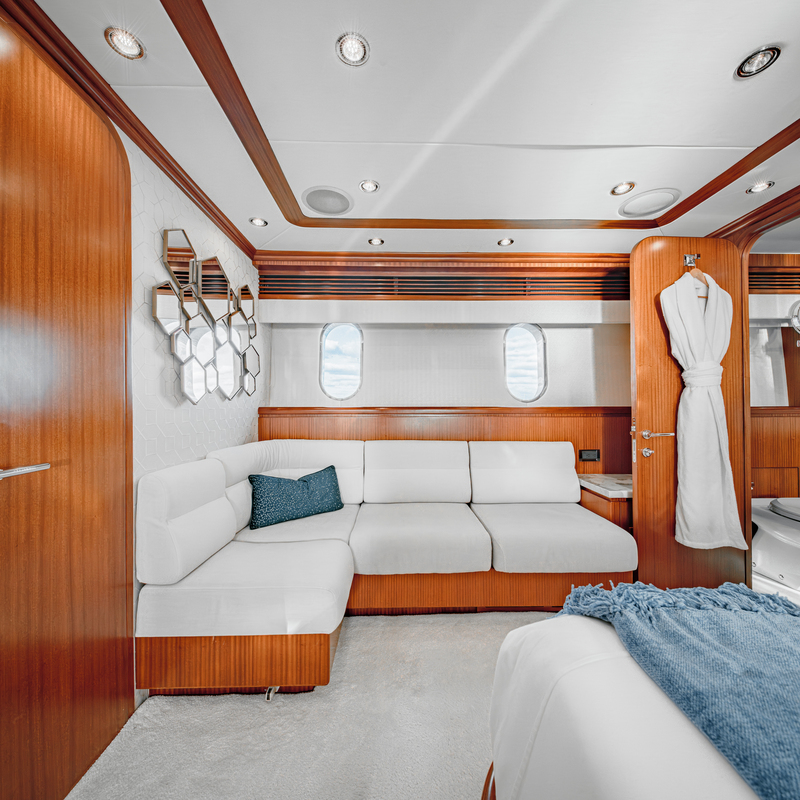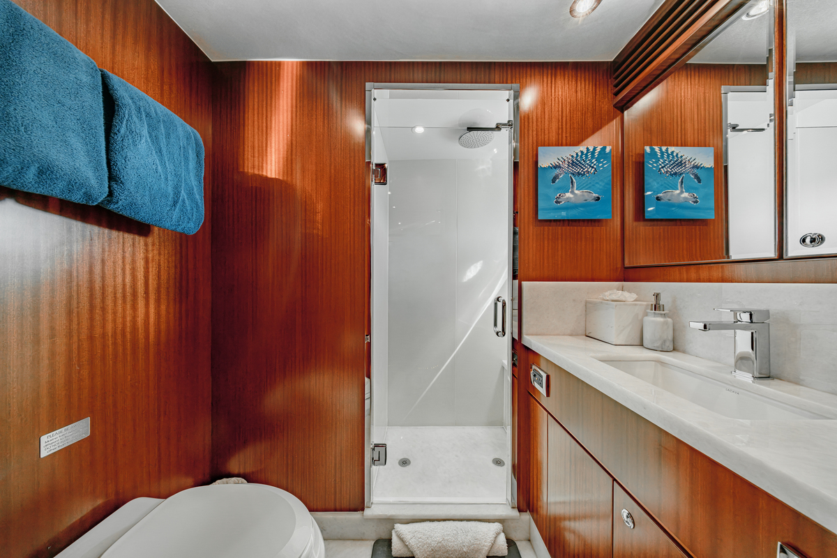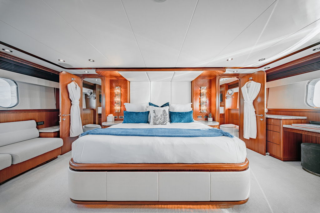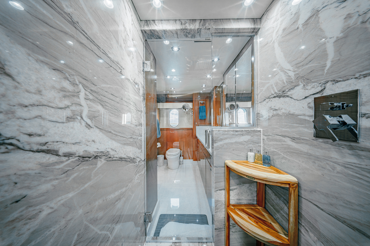 The full-beam master stateroom aboard Beachfront offers a private, elegantly appointed retreat, featuring a king-size bed, refined lounge seating, and abundant natural light through oversized porthole windows. Recently refreshed with new carpet, modern wall treatments, custom artwork, and updated window finishes, the space blends comfort with contemporary sophistication. The suite is complemented by a luxurious his-and-hers ensuite bath, complete with marble countertops, dual vanities, and a spacious granite-clad shower with both rainfall and standard fixtures.