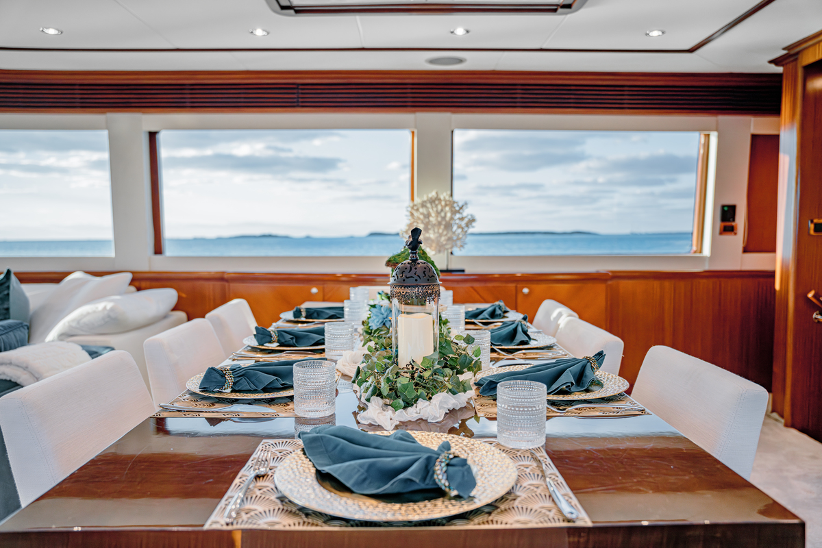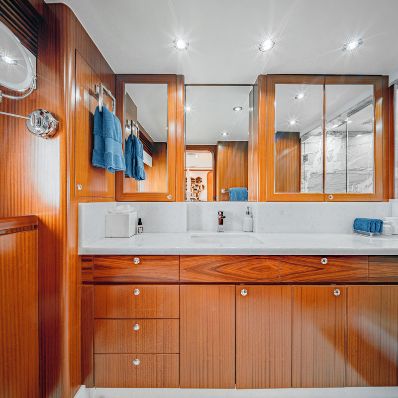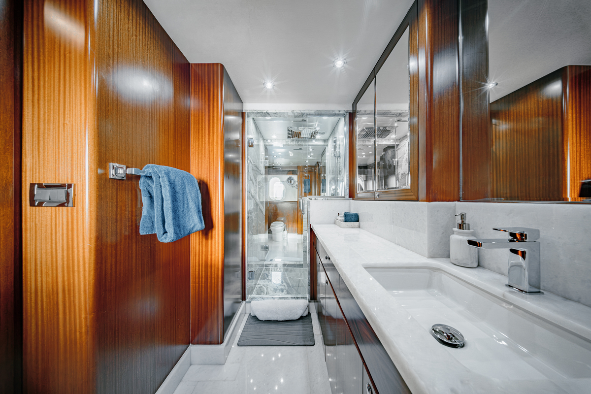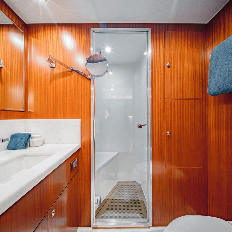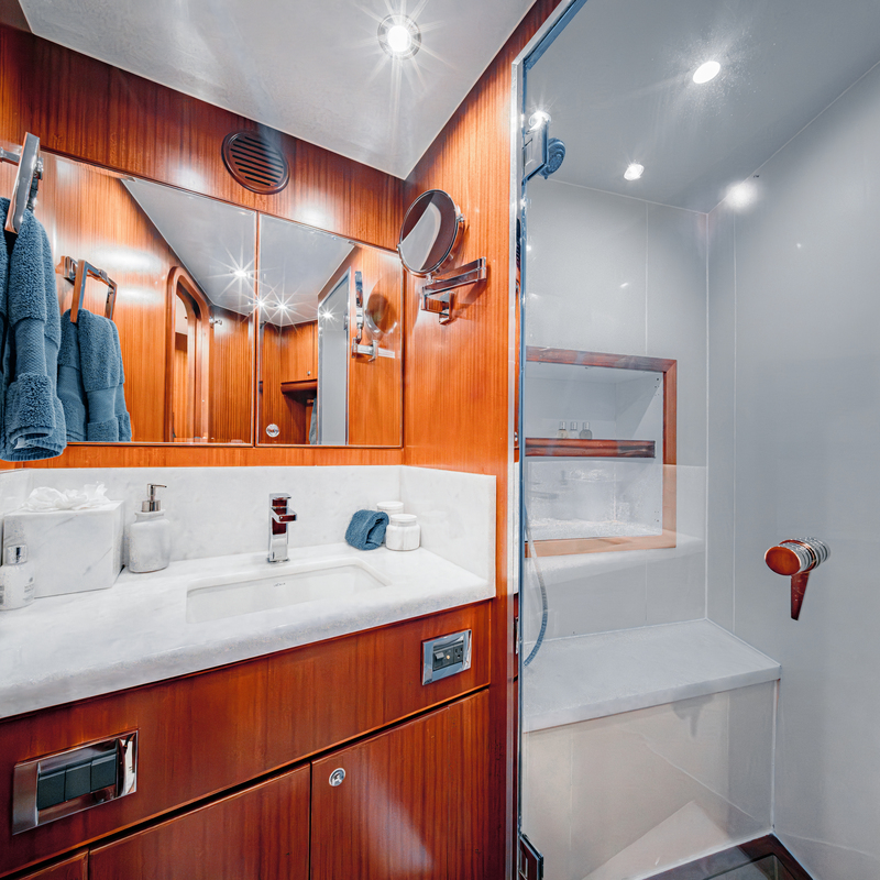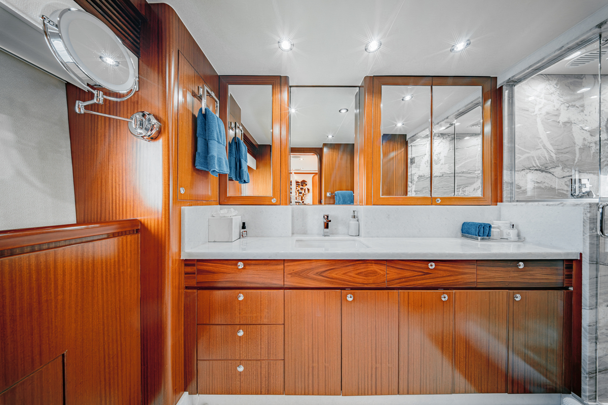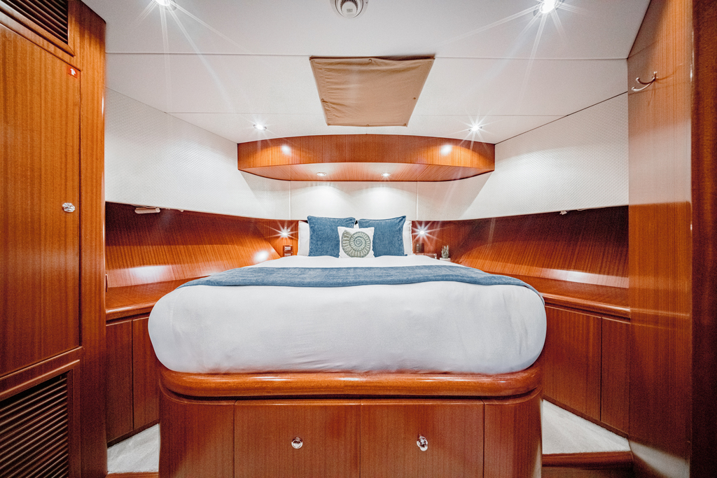The full-beam master stateroom aboard Beachfront offers a private, elegantly appointed retreat, featuring a king-size bed, refined lounge seating, and abundant natural light through oversized porthole windows. Recently refreshed with new carpet, modern wall treatments, custom artwork, and updated window finishes, the space blends comfort with contemporary sophistication. The suite is complemented by a luxurious his-and-hers ensuite bath, complete with marble countertops, dual vanities, and a spacious granite-clad shower with both rainfall and standard fixtures.