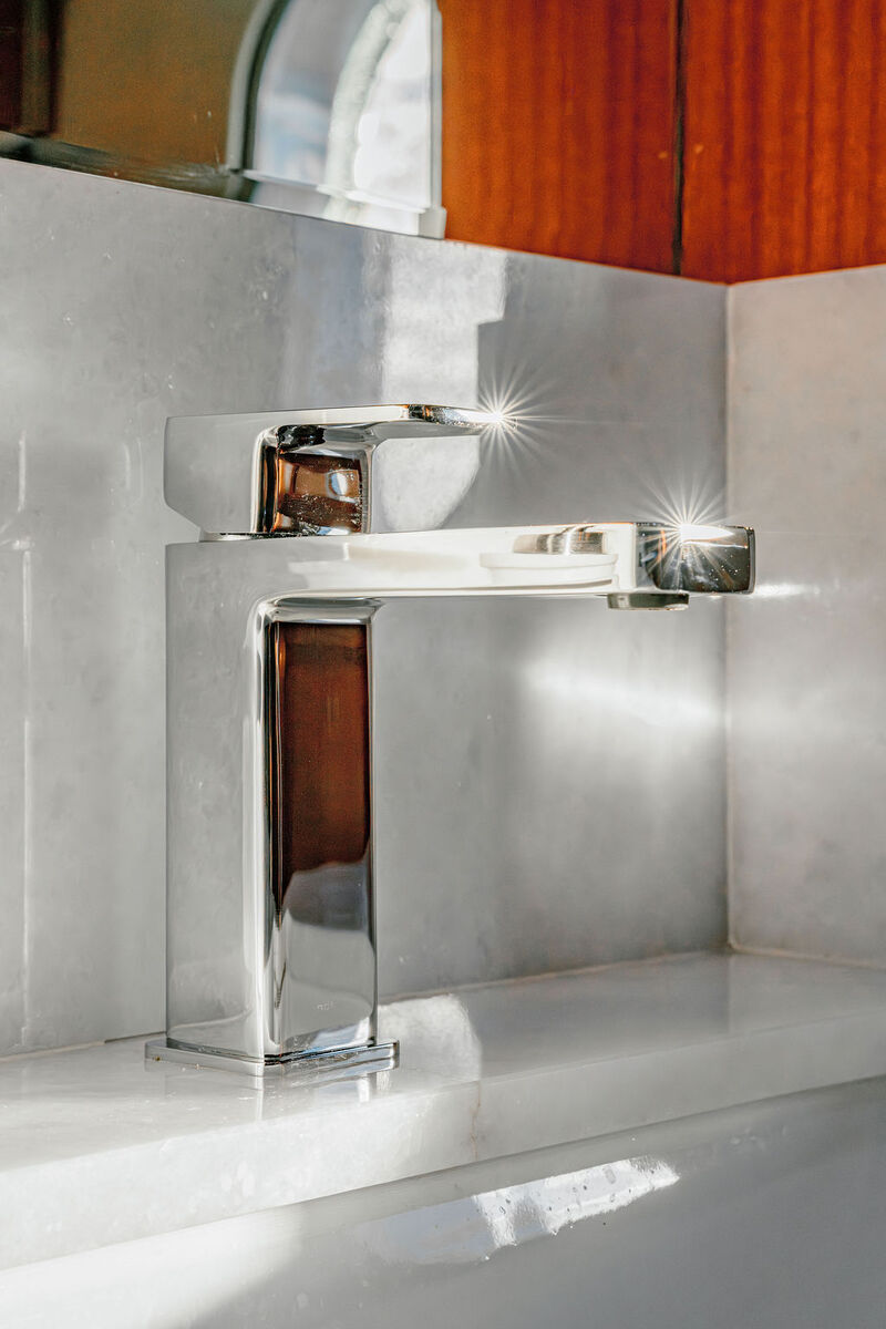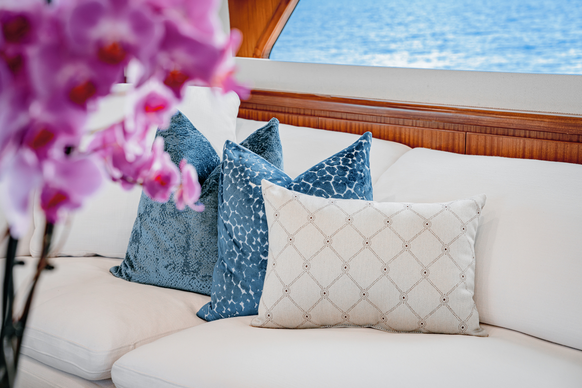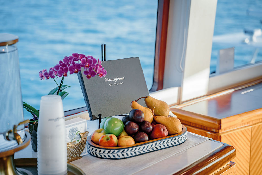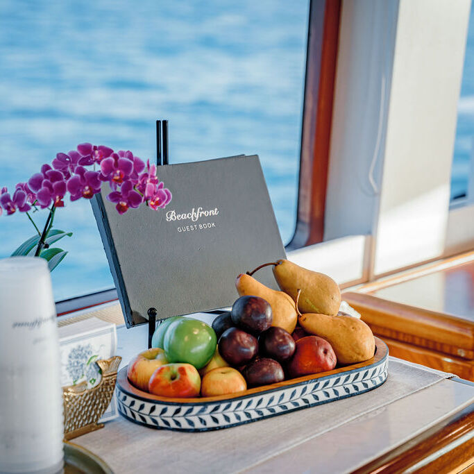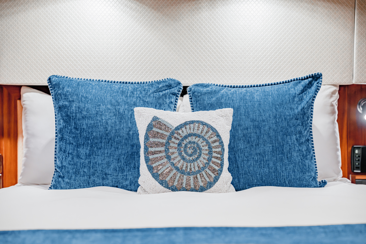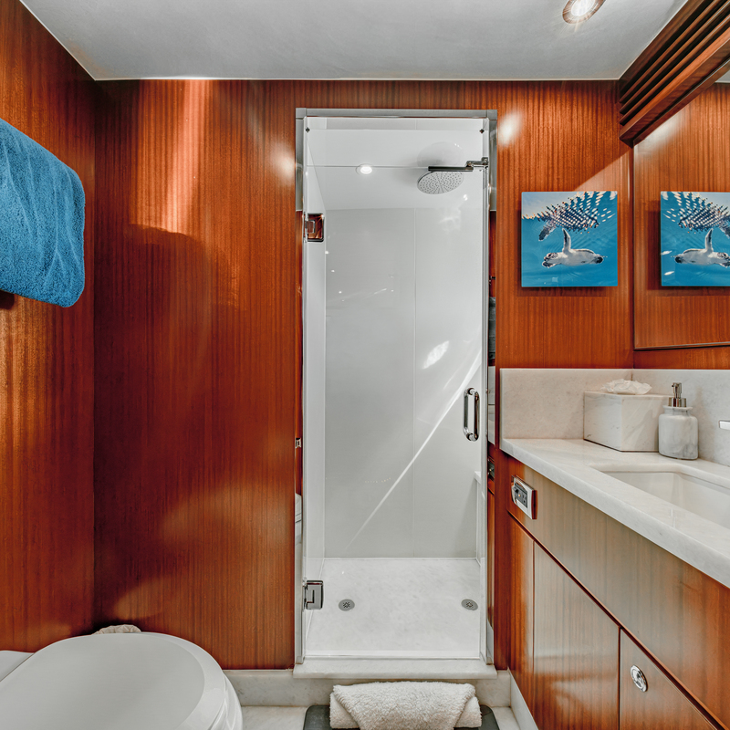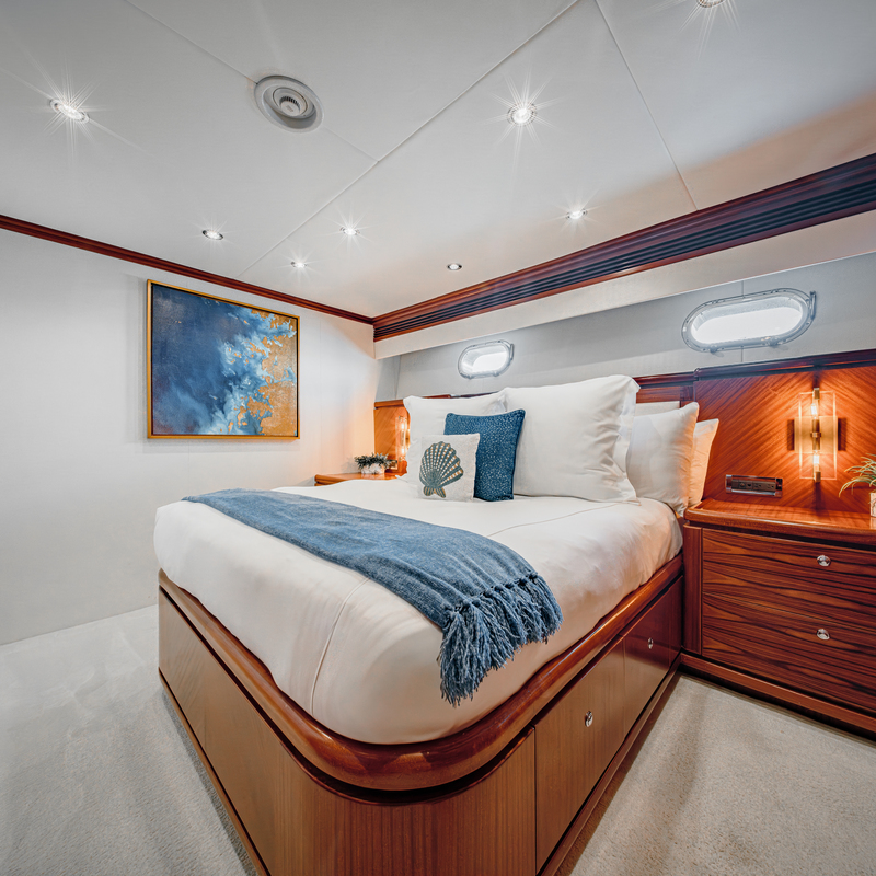 The port and starboard guest staterooms aboard Beachfront offer beautifully appointed, mirror-image retreats, each featuring a queen-size bed, custom artwork, and abundant natural light through dual porthole windows. Recently updated with new carpet and modern window treatments, these cabins provide a comfortable and stylish haven for guests. Each stateroom is complemented by a private ensuite bath, thoughtfully refit with marble countertops, a stall shower with seating, and elegant contemporary finishes.