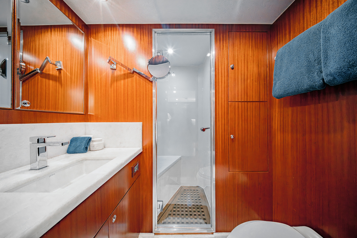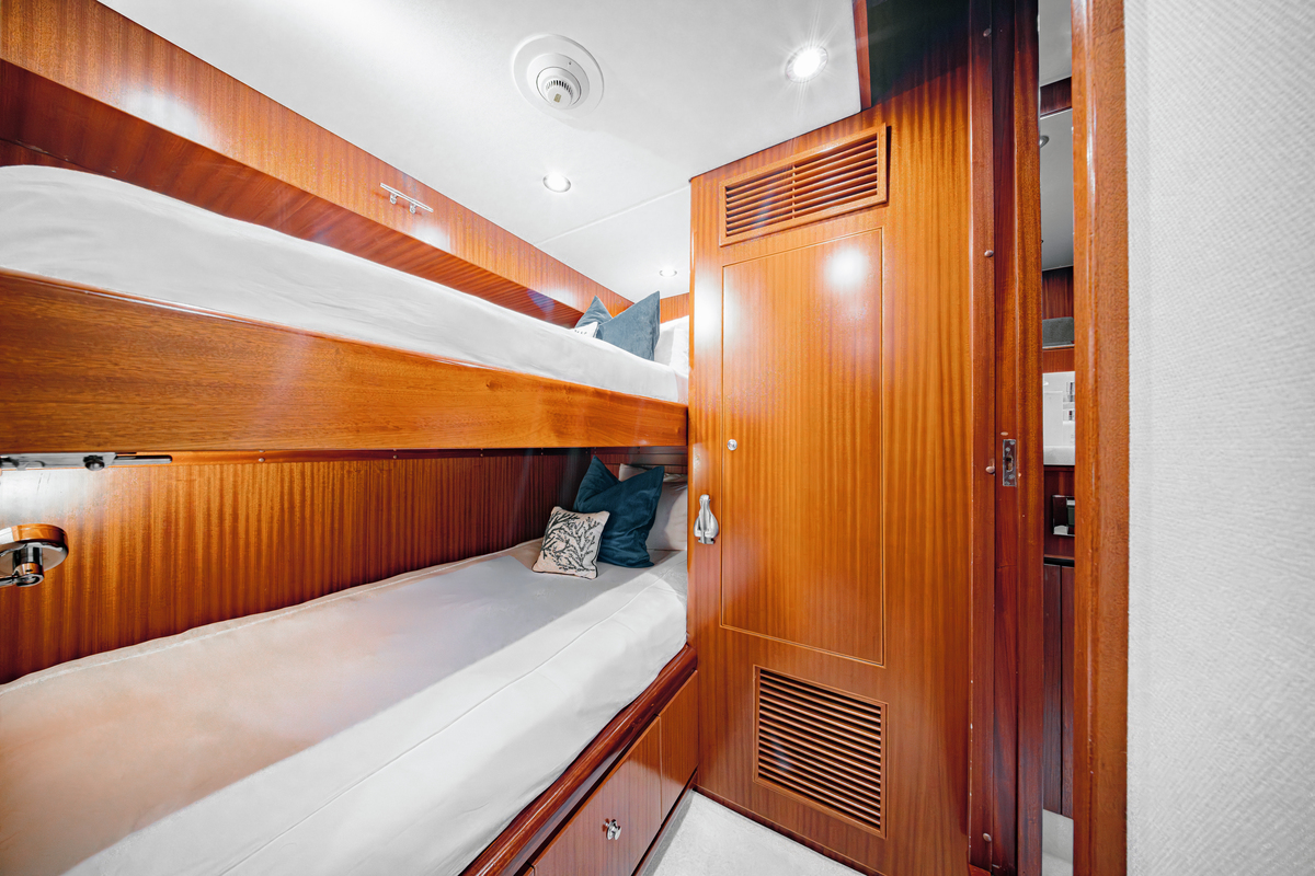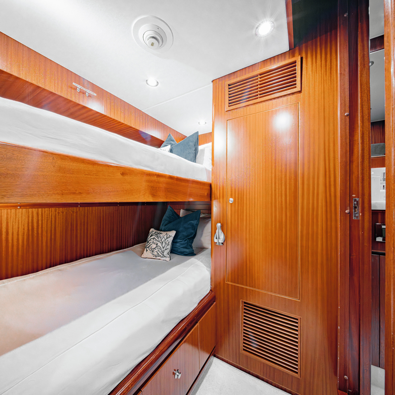 The forward VIP stateroom aboard Beachfront offers a quiet, private retreat, accessed through a cozy lounge landing with seating—perfect for relaxing or catching up away from the main guest areas. The suite features a queen-size bed, tasteful finishes, and recent updates including new carpeting, creating a comfortable and inviting atmosphere. An ensuite bath with marble countertops and a separate stall shower completes the space, delivering both convenience and refined comfort for guests. Adjacent to the VIP stateroom is the twin bunk stateroom on the port side. The twin bunk beds are large enough to accommodate two adults or children. This cabin also features an ensuite bath with sink, toilet, and shower.